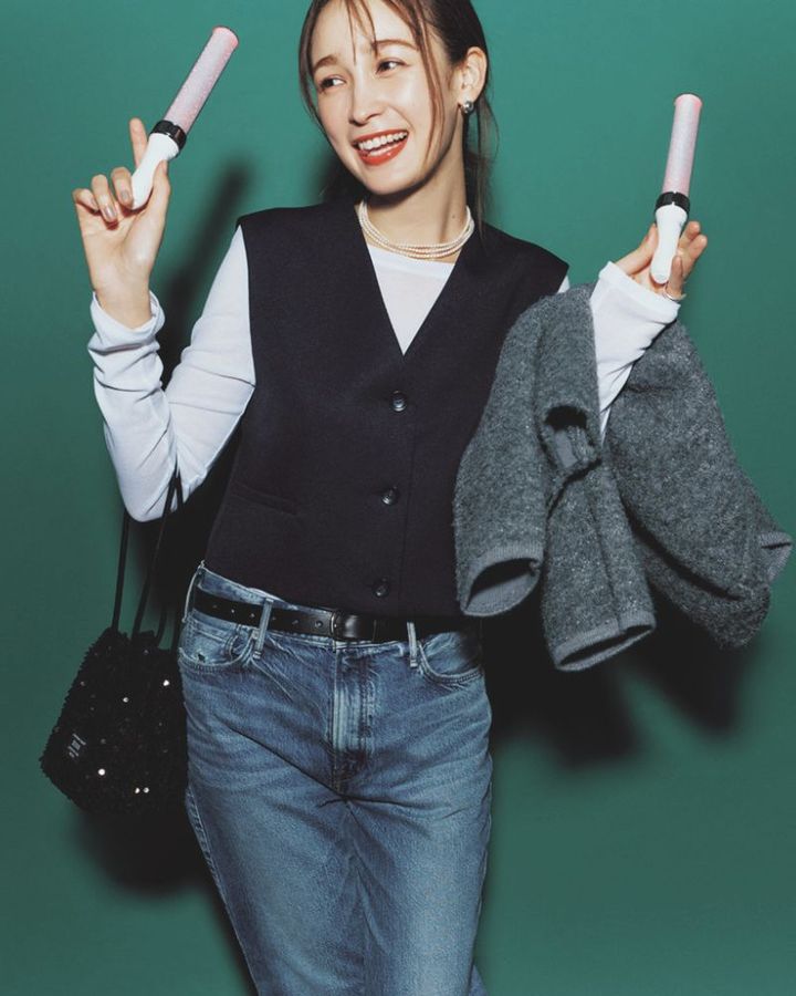 ジレ¥14,300(ノーク)トップス¥12,100(ハウント/ハウント代官山)デニムパンツ¥31,900(アッパー ハイツ/ゲストリスト)手に持ったジャケット¥25,300(アプワイザーリッシェ)バッグ¥3,498(デッサン/ワールド プレスインフォメーション)シューズ¥94,600(パラブーツ/パラブーツ青山店)ピアス¥13,200(ココシュニック オンキッチュ/ココシュニック)ネックレス¥66,000(クードル/MIKIRI)リング¥19,580(バルブス/ZUTTOHOLIC)ベルト¥5,940(ビューティー&ユース/ビューティー&ユース ユナイテッドアローズ 丸の内店)