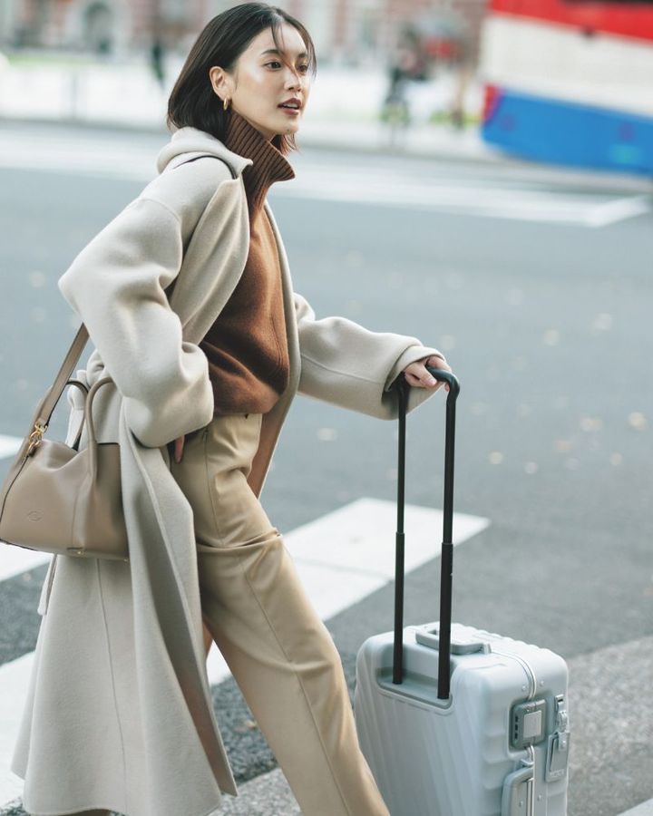 コート¥33,000(ノーク)ニット¥18,920(iCB/オンワード樫山 お客様相談室)パンツ¥35,200(セオリー/リンク・セオリー・ジャパン)バッグ¥322,300(トッズ/トッズ・ジャパン)キャリーケース¥151,800(トゥミ/トゥミ・カスタマーセンター)ピアス¥20,900(DAUGHTERSJEWELRY)
