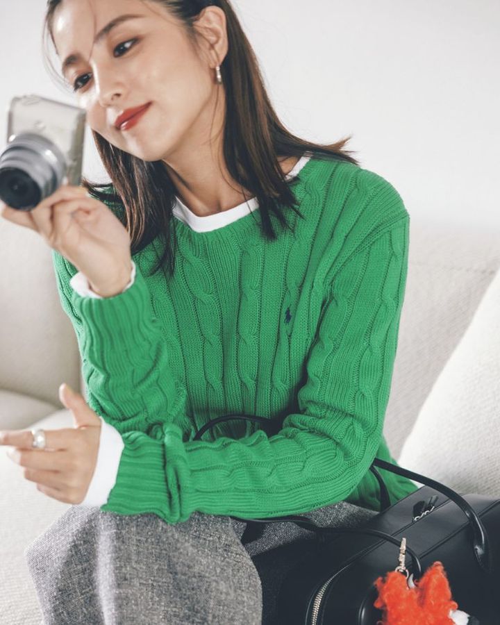 1点投入でコーデがグッと華やかになるカラーニットを取り入れる日は、子供見え回避を意識。インナーに白Tをレイヤードしてメリハリをつけるだけで、こなれた装いが完成します。ボトムスはボンディング素材の立体パンツを合わせて、カジュアル感を打ち消す大人っぽさを。仕上げに黒の皮小物でキリッと引き締めて、大人なワンツーコーデの完成です。