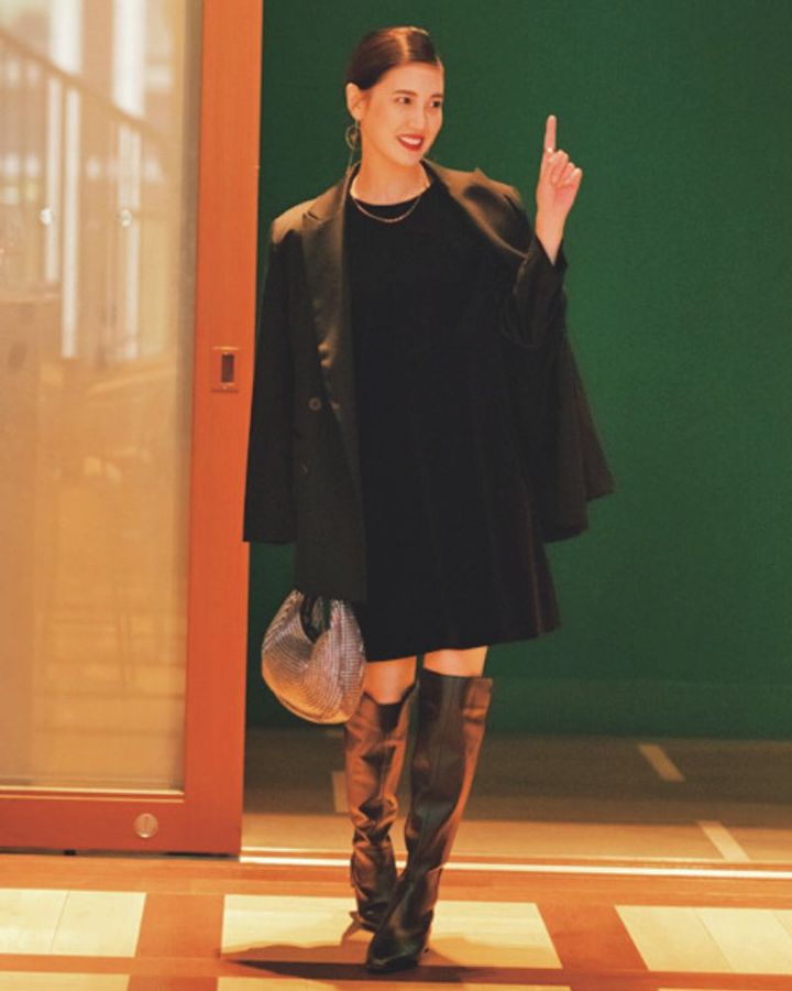 3月8日(土)、よそ行きだけどオケージョンよりかしこまりすぎないホテルディナーのコーデは、ナイトアウト感漂うオール黒で色気を漂わせるとうまくいきます。ベルベット素材のミニワンピを投入するだけで、重厚感が備わりリッチな佇まいに。嫌味のないよう引き締めアイテムのジャケットを肩がけして、上品に纏うのが大人の鉄則です。仕上げにジュエリーやブーツ、メタルのバッグで光沢感を足してドレッシーに底上げを。