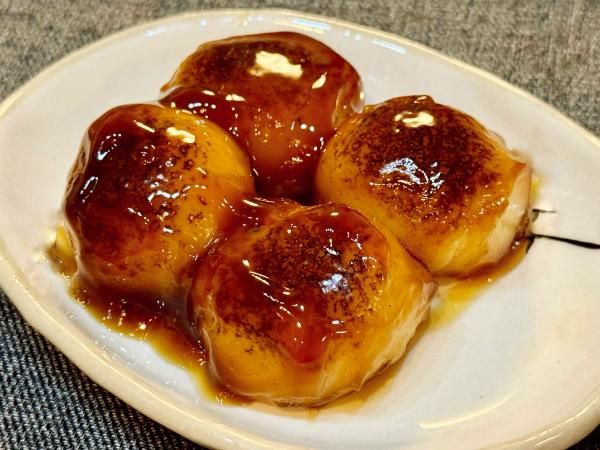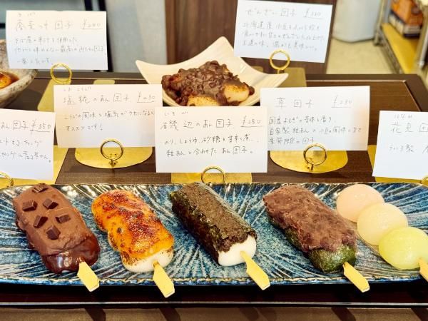 「蕎麦つゆ団子」(280円)は、お蕎麦屋さんのつけ汁を使用した、出汁の風味が香る、少し珍しい和菓子。上品な甘みが後を引く新鮮な味わいです。