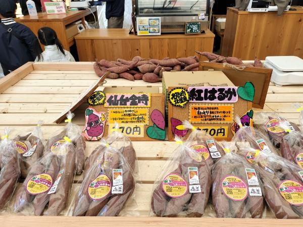 ボリュームのある袋詰めされたサツマイモ。奥には量り売りもありました。