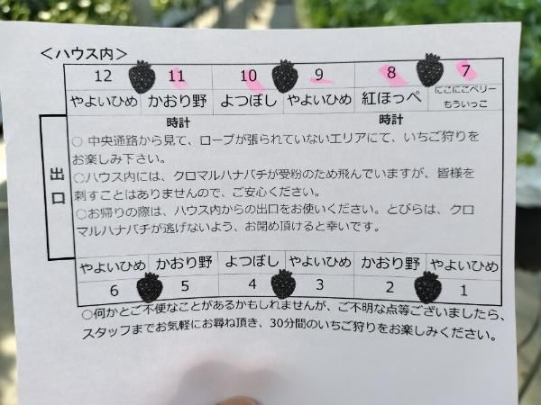 ハウス内の説明の紙をいただきました。さまざまな品種のいちごが。案内を見ながら、いちごの食べ比べが始まります♪