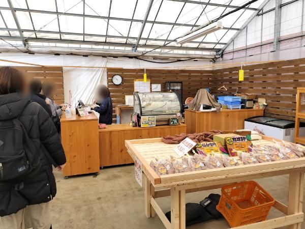 中に入ると、受付と直売所になっていました。 採れたてのいちごと、この日はサツマイモが販売されていました。