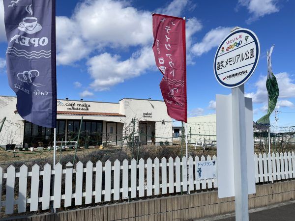 お店はちょうど「震災メモリアル公園」バス停の目の前。バスだと、名取駅の東口バス停前から閖上線下りに乗れば20分ほどでお店に到着しますよ。