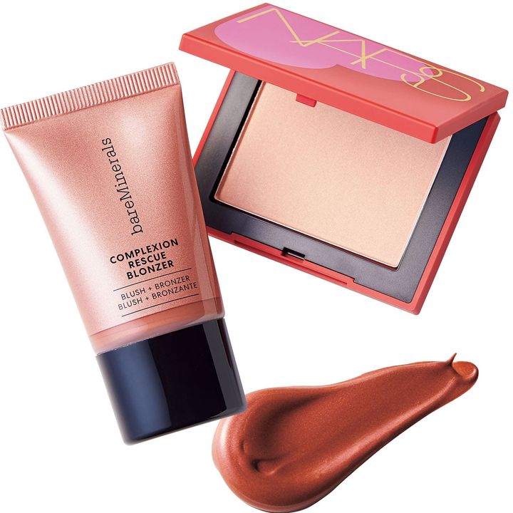 左:モデル使用色。扱いやすいクリームタイプ。CR ブロンザー キス オブ ローズ 15ml ¥3,960(ベ アミネラル)右:アプリコットベージュのカラー。ナチュラルなツヤをプラス。ブラッシュ N 925A ¥5,060 ※数量限定発売(NARS JAPAN)
