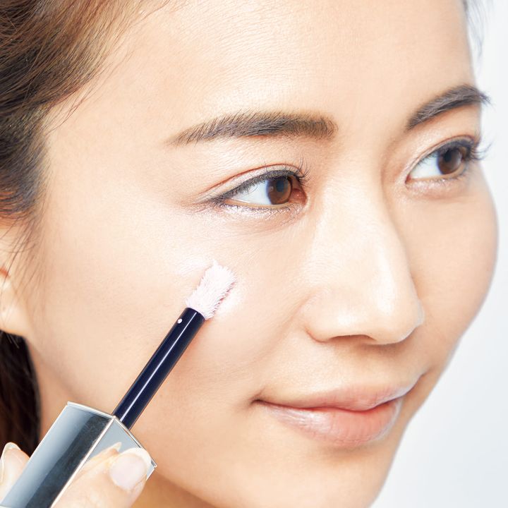 こめかみから黒目の下までハイライトを。色は目元のカラーのつなぎにもなる、ライラックがオススメ。透明感を与え立体感のある顔立ちに。