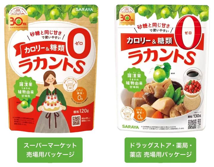新パッケージの「ラカントS」には30周年ロゴをあしらい、料理を前面に表現
