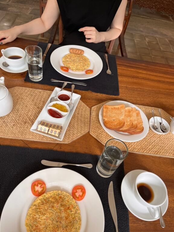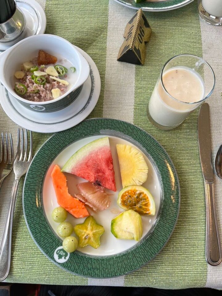 とある日の朝食。お皿の左下にある「ネッリ」というスーパーフード(果物)。とても体にいいらしいのですが、あまりにも苦くて食べられませんでした....。のちのち現地の人に聞いたら、あまり生で食べるものではなかったようです。
