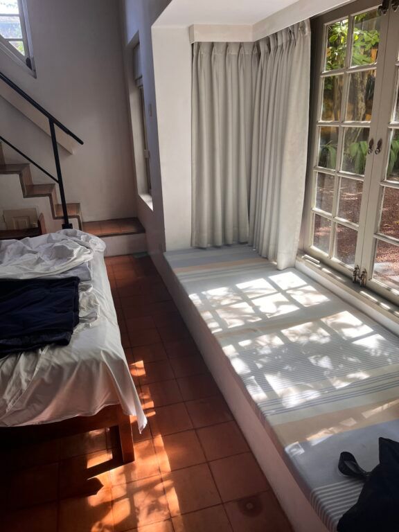 泊まった部屋。右手には中庭があり、朝からたっぷりの光が入ります。左手の階段を上ると椅子が数脚置かれたスペースがあり、好きな音楽を流しながら読書する時間が至福でした。