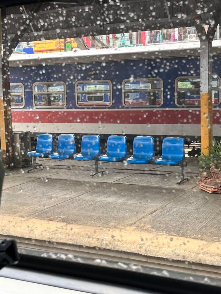 スリランカ鉄道に乗っていたら、急に雨が降ってきました。スコールです。途中駅で見た、ずらりと並ぶ椅子が美しかった。