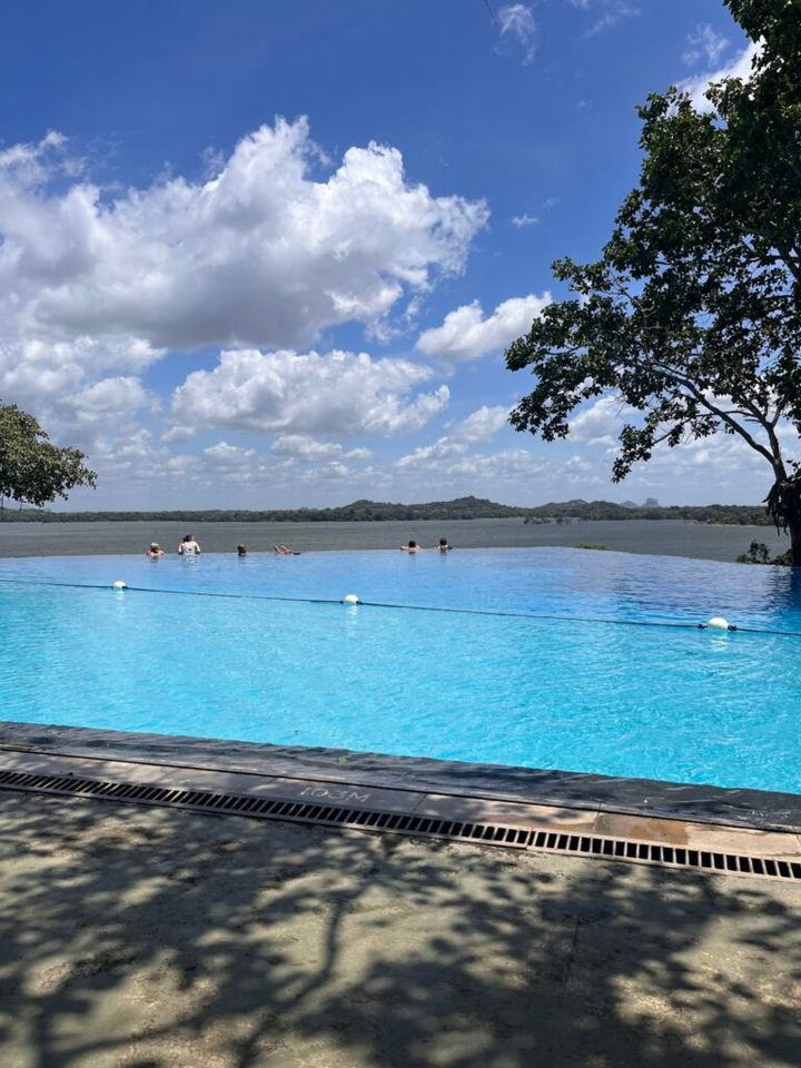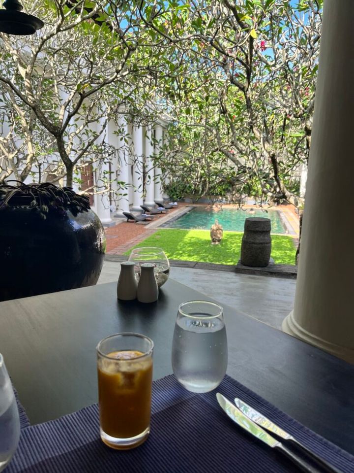 ゴールのホテルにて。朝ごはんは、プールを眺めがら。コロンボ、ヌワラエリアとはうって変わって、湿度の高い海辺の街でした。