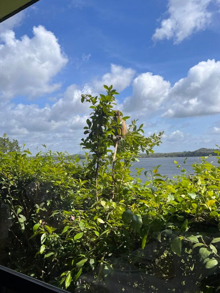 朝食のバイキングを食べていたとき。視線を感じて、窓の外を見たら、サルが!