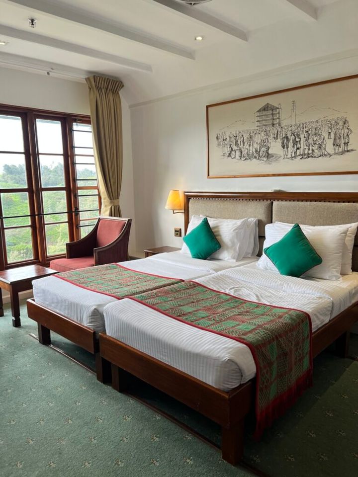 高原地帯のヌワラエリアで泊まったホテルの一室。窓の外には紅茶畑が広がっています。