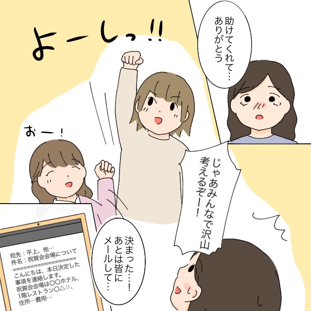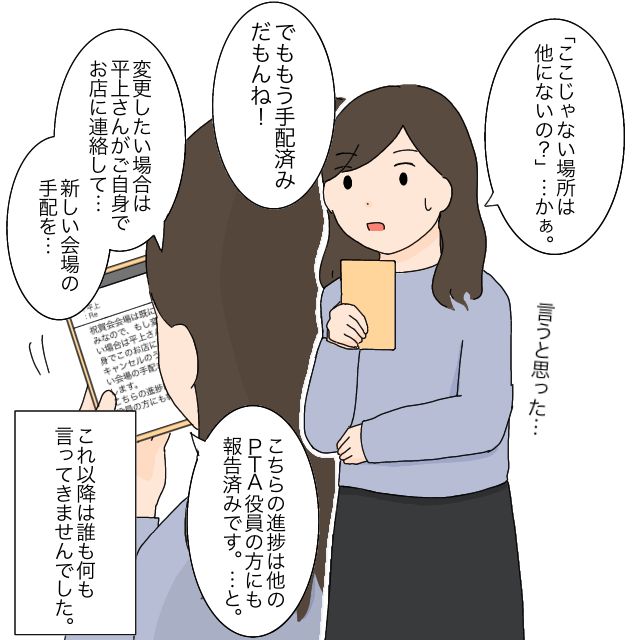 全てを手配し、クラス委員長であるだい君ママにメールで伝えたところ、案の定『ここじゃない場所は他にないの?』と返信してきました。でももうひかるさんに迷いはありませんでした。『変更したい場合は平上さんがご自身でお店に連絡して、新しい会場の手配をお願いします。こちらの進捗は他のPTA役員の方に報告済です。』と返すと、それ以上、誰も何も言ってきませんでした。