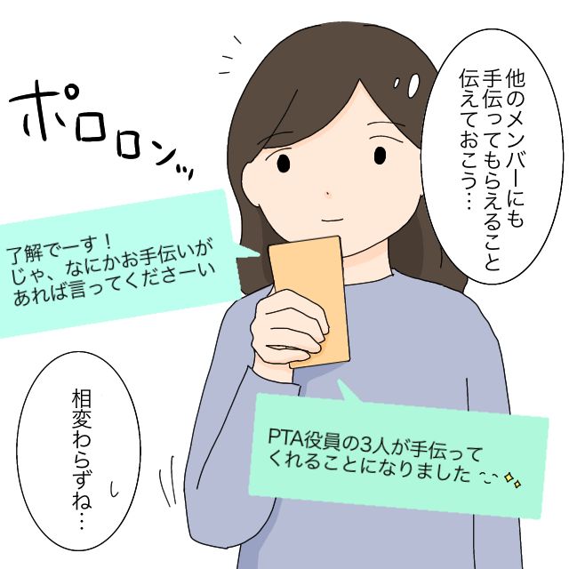 はる君ママのおかげで3人のPTA役員さん達も手伝ってくれることになったひかるさん。一応、卒業祝賀会係のメンバーにも伝えましたが、反応は「了解でーす!じゃ、なにかお手伝いがあれば言ってくださーい」と、自分が係であるにもかかわらず、やはりやる気のないものでした。