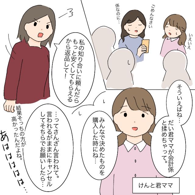 「私の知り合いに頼んだらもっと安くしてもらえるから返品して!」とさんざん言われた会計係さんが言われるがままキャンセルし、だい君ままにお願いしたら結局そちらの方が高くついてしまったというのです。