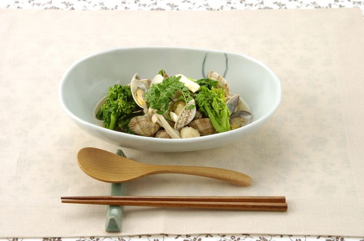この日のテーマは「貝を味わう」。あさりに菜の花を合わせた春の香りいっぱいの一品「菜の花とあさりの蒸し煮」を辻調理師専門学校の長谷川晃先生から教わった。