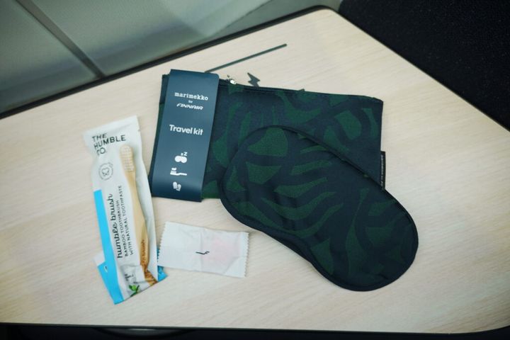 ビジネスクラスのアメニティ。〈マリメッコ〉のポーチには、同柄のアイマスク、バンブー製の歯ブラシは〈ザ ハンブル コー〉。