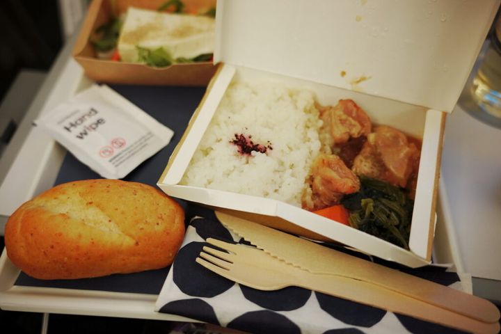 エコノミークラスの機内食。プラスチックを使わず、紙パッケージと木のカトラリーで統一。紙ナプキンは〈マリメッコ〉。