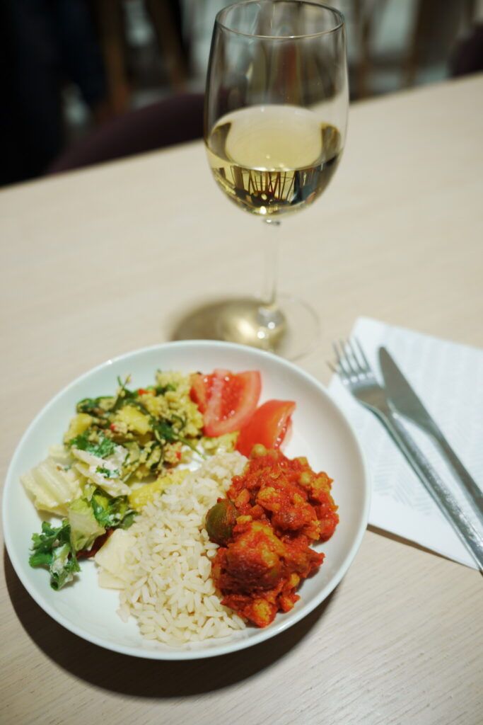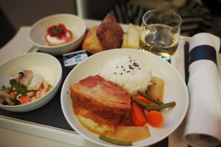 ビジネスクラスの機内食。ディナーは前菜2品、3種類から選べるメインコースと数種のパン、チーズ、デザート。