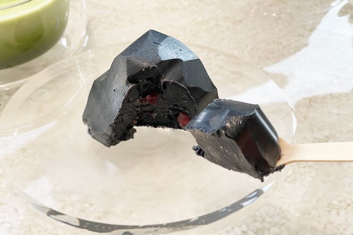 渋谷店のシンボルマークである溶岩石が見事に再現された黒いチーズケーキはインパクト大! 竹炭パウダーで色をつけ、型もなんと特注なのだそう。