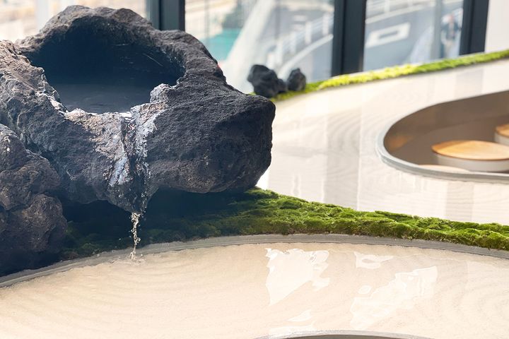 一番のポイントは、大胆な曲線を描く“水のテーブル”です。テーブルには枯山水のように白い玉石が敷き詰められ、その上には水が張られています。テーブルの周りの苔や溶岩石のオブジェも趣があり、まるで小さな日本庭園のよう。