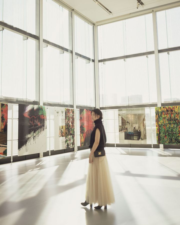 ルイ・ヴィトンの世界観を全身で感じられる贅沢な空間。表参道の景色が一望できるガラス張りで「心地よく作品が鑑賞できる場所」(美月)。3/16までアメリカ人アーティスト“ウェイド・ガイトン”による個展「Thirteen Paintings」を開催。2022年に制作された13点からなる絵画作品「UNTITLED」が世界初公開中。