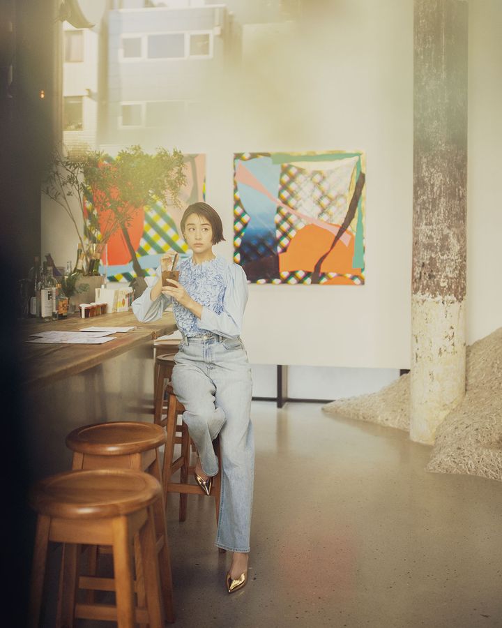 「京橋の街に合う落ち着きで、いい意味で敷居が高いイメージでしたが、そのイメージから贅沢な気分になれる場所。スタッフの方の佇まい含め、この空間の世界観が隅々まで徹底されていました」(美月)ジャケット¥39,600(mallow blue)カットソー¥14,300(HER.)パンツ¥18,700(JILKY)バッグ¥39,600(ケンブリッジ サッチェル/エスピービー)靴¥39,600(リュニック エ モア/TOKEN)靴下¥3,850(ファクイ)メガネ¥58,300(アイヴァン PR/E5 アイヴァン)ネックレス¥18,700リング¥13,200(ともにラ・スール)