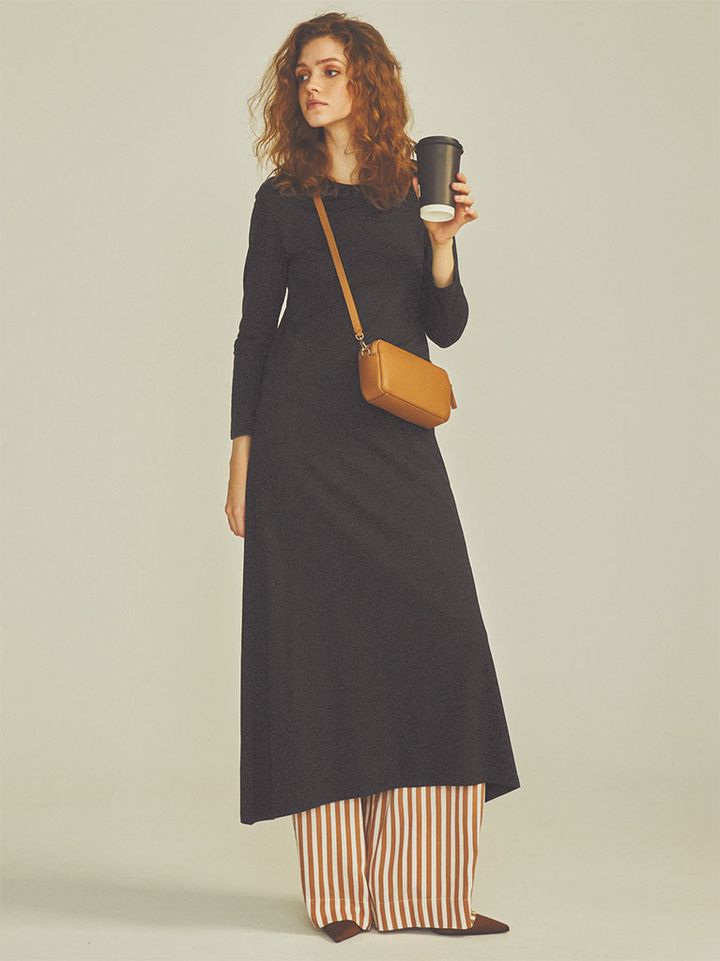 いい意味で無表情だからアレンジもしやすい黒ワンピース。コンパクトな上部分と胸下からなだらかに広がるシルエットで、着るだけで体は華奢に、脚はラインを気にせず長く伸びて見せることが可能。ほどよい厚さのあるカットソー素材は、アタリが出にくく、どんな服とも組み合わせやすい素材。