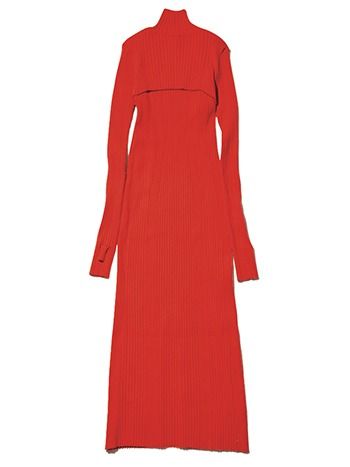 オレンジストレッチリブタートルニットワンピース/venit(ハルミ ショールーム) 全体的に細身のシルエット。トップの部分をよりコンパクトに仕立て、通常のウエストの位置より高めに、さりげなく絞りを入れた、ウエストを高く見せる設計。目を引く鮮やかなオレンジも、やわらかなニットなら印象が和らぐ。手までを覆える長めのそでも旬。
