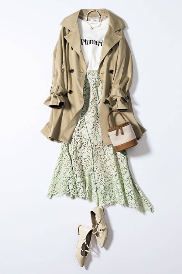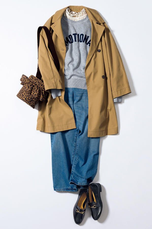ロゴTに羽織るトレンチコートも、女っぽいきれいめシルエットでフェミニン感を。