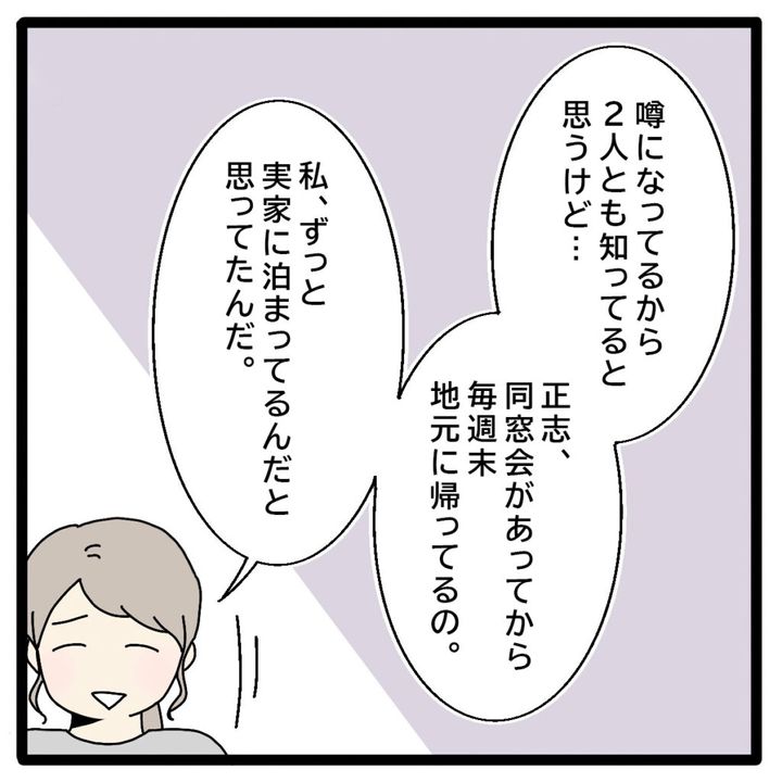 「噂になってるから2人とも知ってると思うけど・・正志、同窓会があってから、毎週末地元に帰ってるの。私、ずっと実家に泊まってるんだと思ってたんだ」