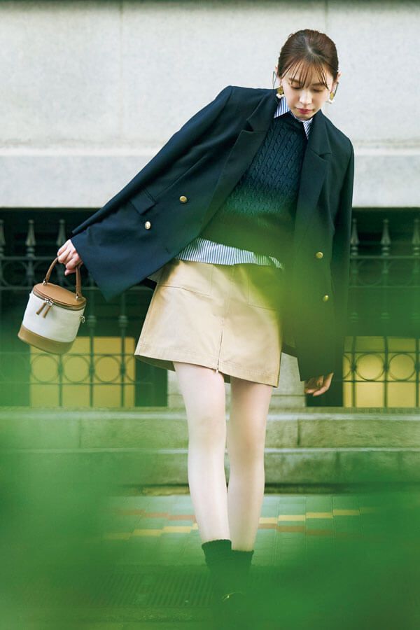 ジャケット¥8,899/VIS(ジュンカスタマーセンター) ニット[襟付き]¥7,590、スカート¥9,900/ともに31 Sons de mode(ヒロタ) シャツ¥9,990/PLST バッグ¥3,690/神戸レタス ピアス¥22,000/ジゼルベー(ズットホリック) ソックス¥1,210/靴下屋(タビオ) ローファー¥20,900/ワシントン(銀座ワシントン銀座本店)