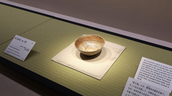 《彫三島茶碗 銘 九重》。彫三島は花文が散らされていることから、春に好まれるそうです。 釉薬をたっぷりとかけられた柔らかい仕上がりは春の茶の湯に相応しい茶碗です。
