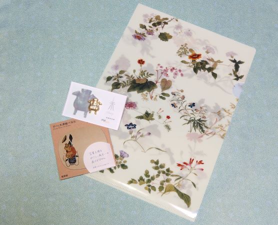 ミュージアムグッズは、根津美術館オリジナルピンバッチ「未」(2‚000円)、大津絵付箋 瓢箪(550円)、A4クリアフォルダ 秋草図巻(400円)を購入。 オリジナルピンバッチは根津美術館所蔵の重要文化財《双羊尊》をモチーフにしています。