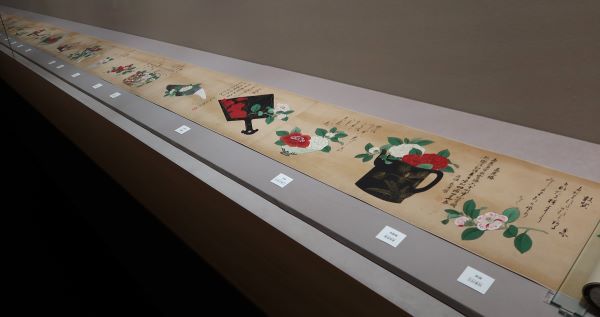 同時開催は、様々な器物に生けられた椿の図が鮮やかな《百椿図》です。