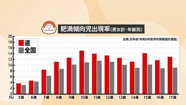 『肥満傾向』にある子どもの割合を示すグラフを見ると、北海道では幼稚園児から高校生までのすべての年齢で、全国の値を上回りました。