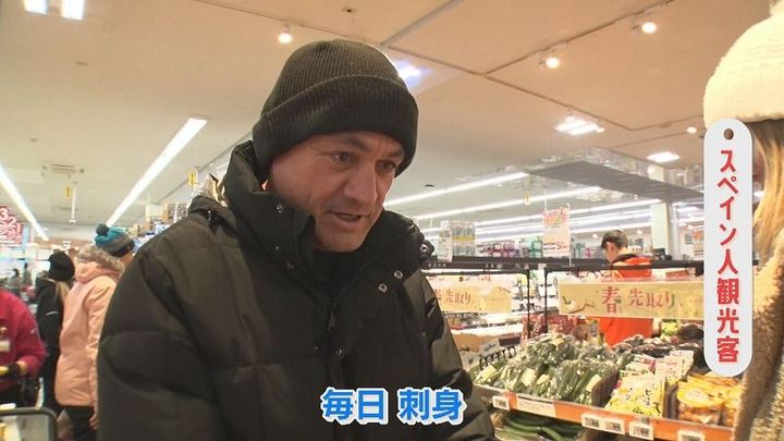 番組スタッフ:「お刺身ずいぶん買ってますけど、これはご自身で食べるんですか?」スペイン人男性:「エブリデー刺身。枝豆、モロキュー…」