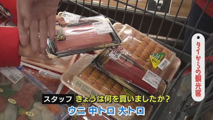 番組スタッフ:「今日はちなみに何を買いましたか?」タイ人男性:「ウニ、中トロ、大トロ」