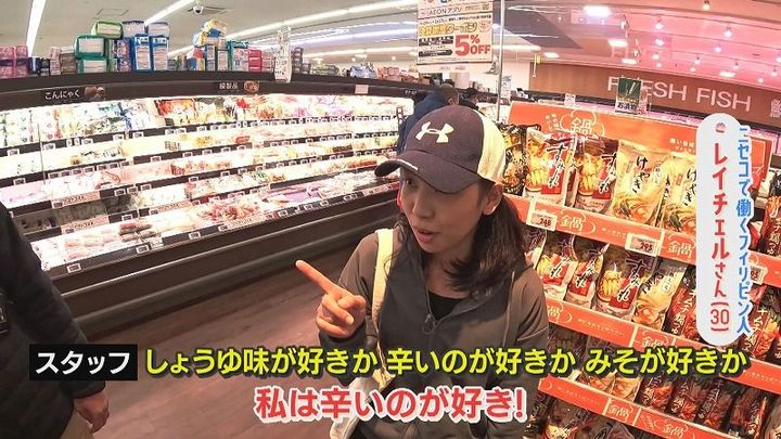 番組スタッフ:「しょうゆ味が好きか、辛いのが好きか、みそが好きか?」レイチェルさん:「私は辛いのが好き!」