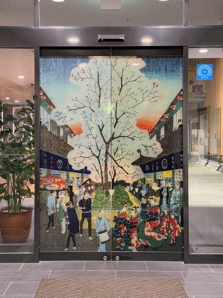 場所は浅草・浅草寺の横にある台東区民会館9F。「もしかして建物の一角だけ?」と思いながら中に入ると、区民会館の入口ドアやエレベーターホールにまで江戸風情を感じる絵画が!これはいやがおうでも期待が高まります。