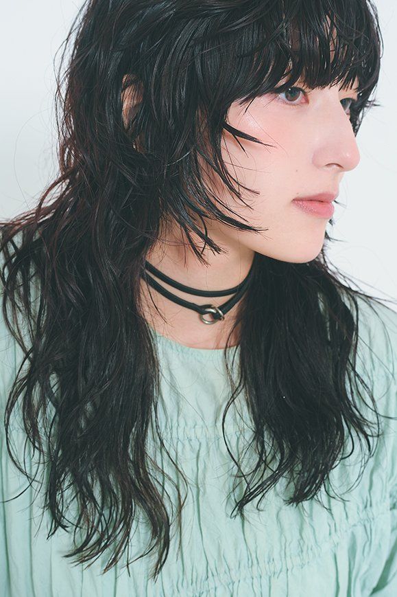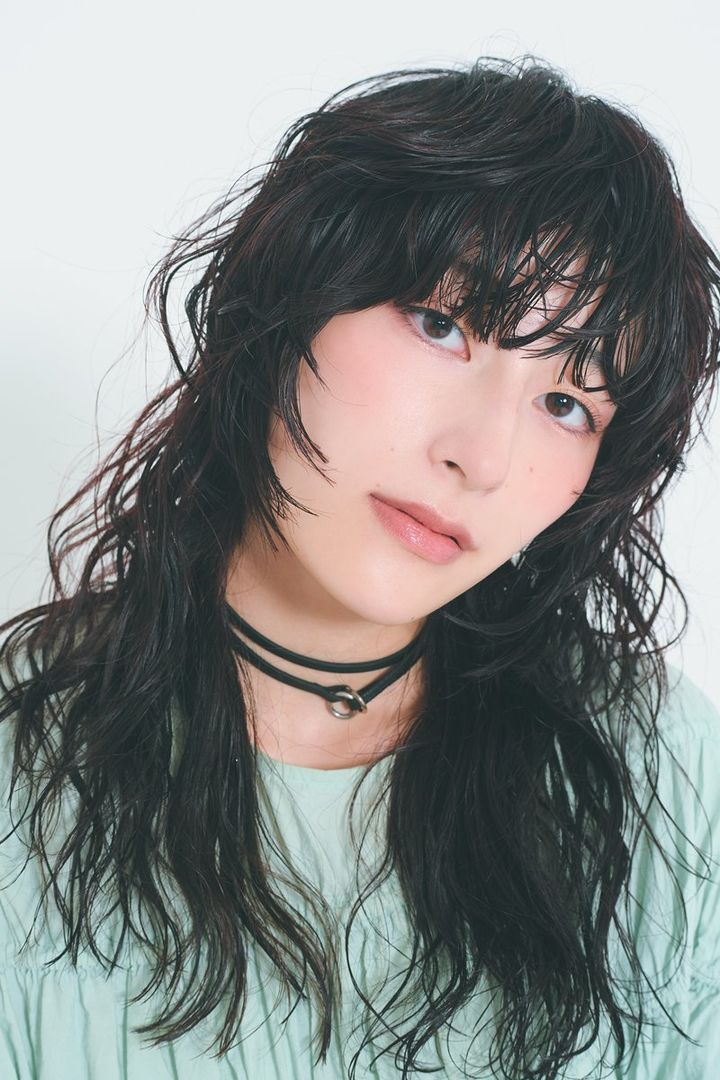 やせ見えを狙った顔まわりデザインも、似合わなければ逆効果。輪郭に合わせることがフィット感アップの秘訣。フルバングで横のラインを出して面長顔を中和し、前髪横からあご下までの間にレイヤーを入れてアクセントに。大きめカールをプラスしてボリュームを出し、顔の面積を視覚的に縮小。