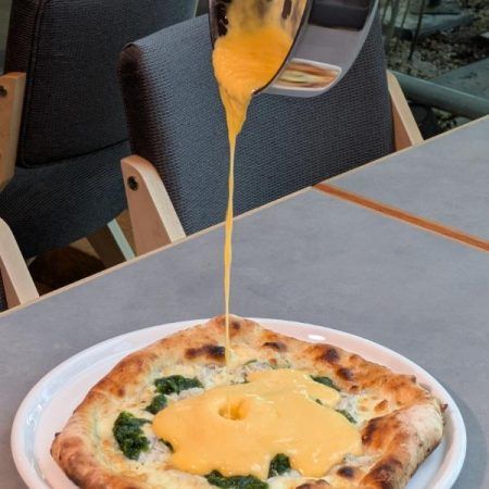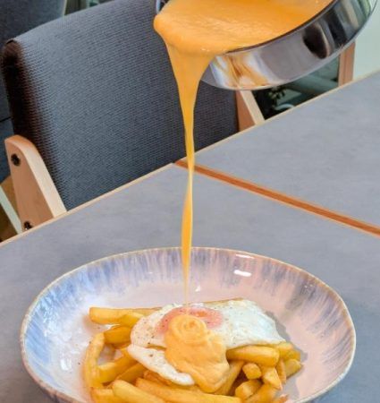 「ポテトフライ トロトロ半熟玉子のせ トリュフ風味」 1,320円(税込み) にさきほどの「追いフォンドゥ チーズ」1,500円(税込み) をプラス。チーズにおぼれたいアナタに。