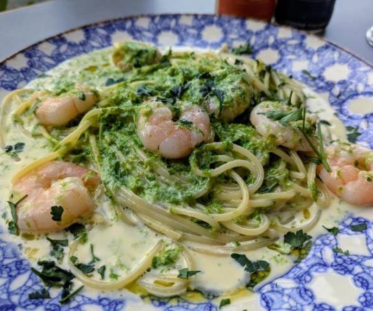 熊本・天草のアオサを使った 「アオサ海苔と小海老のクリームソース スパゲティ柚子胡椒風味」 1,870円(税込み)
