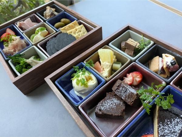 ”Afternoon at ISOLA” として、平日14:00〜16:00(L.O.)に 提供される「イタリアン重箱 1ドリンク付き」(左)と 「デザート重箱 カフェ付き」(右)はいずれも3,300円(税込み)