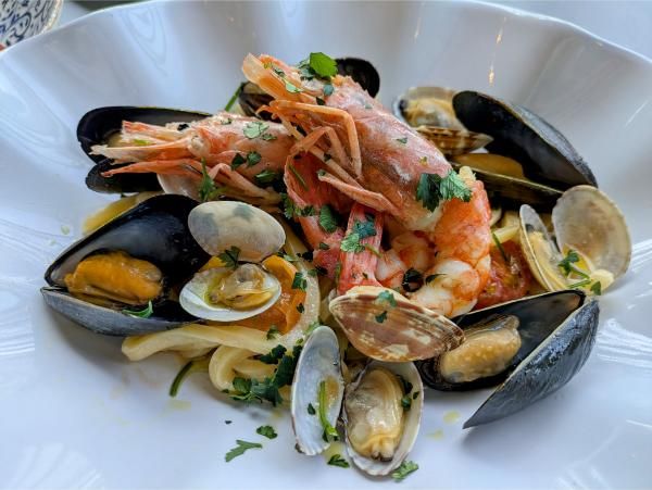 「 ”フルッティ ディ マーレ” 魚介類とチェリートマトの シェラティエッリ」 2,530円(税込み) 一見、うどんのような太さの麺。海老や貝、トマトの旨味を吸っていて魚介類の風味がふんだんに味わえる