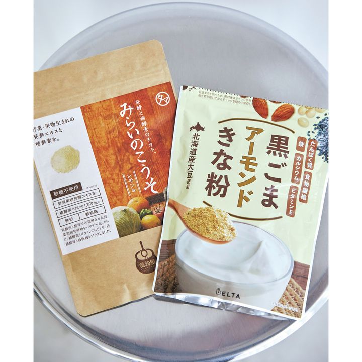 とにかく健康第一。黒ごまアーモンドきな粉はおみそ汁に入れるとコクが出て美味しくなり、野菜のごま和え衣にも重宝。みらいのこうそは酵素玄米に入れてよりパワーアップ。