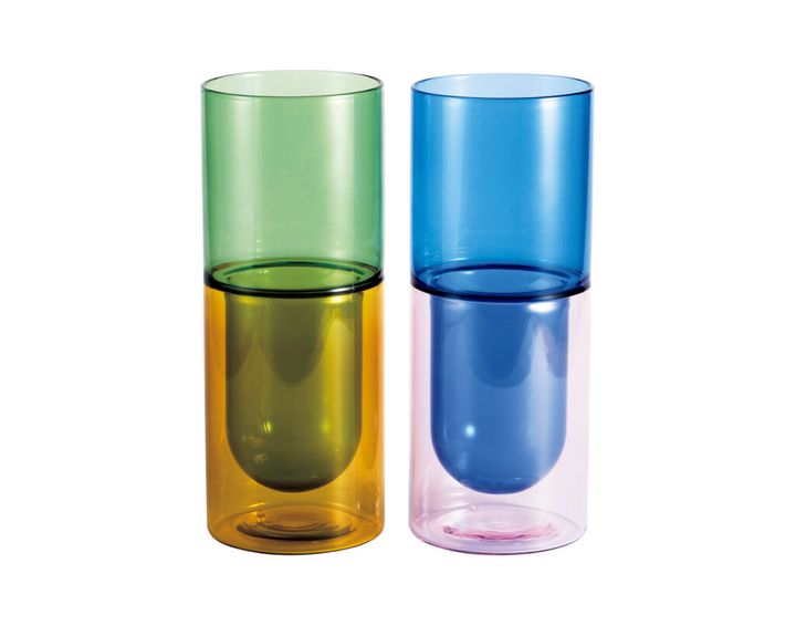 “生活にアートを”というコンセプトのもと、彩り豊かなインテリア雑貨を展開する〈アマブロ〉。新たに登場したフラワーベースは存在感のあるツートンカラー。花を一輪生けるだけでも華やかな印象に。下部が二重構造になっているのもユニークで、色の重なりが奥行きを生み出す。耐熱ガラス製なのでキャンドルホルダーとしても使用可能。