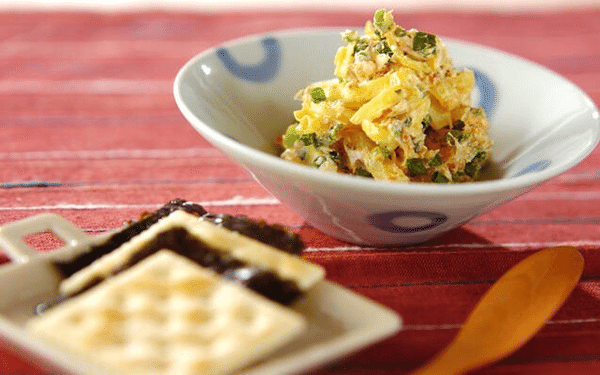 あらかじめ室温に戻しておいたクリームチーズに、刻んだたくあんを混ぜれば出来上がり! 焼きのり&クラッカーにのせれば、たちまち和洋折衷のおつまみになります。クラッカーのほか、バゲットやうす切りトマトと食べても◎です。